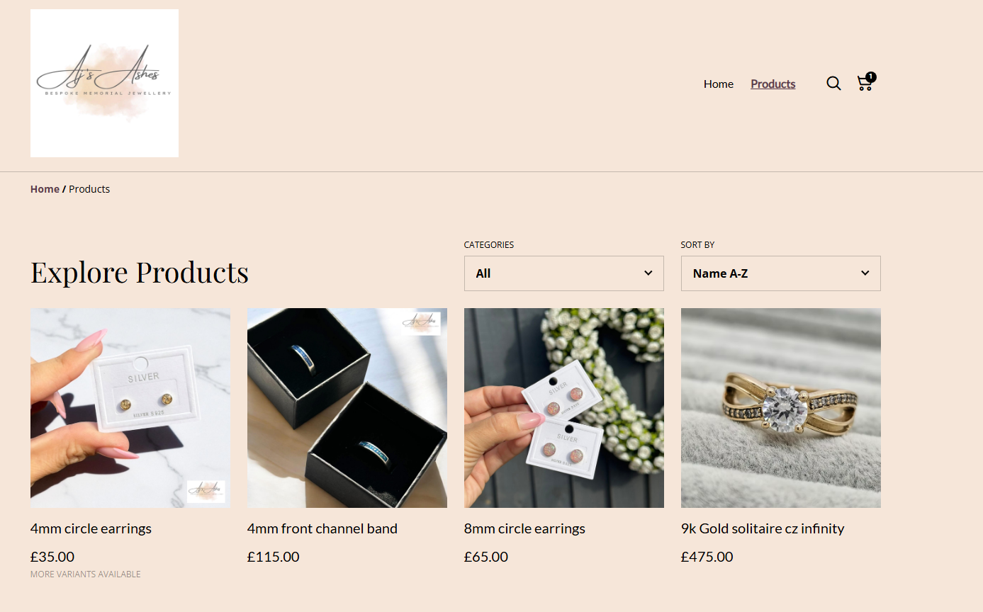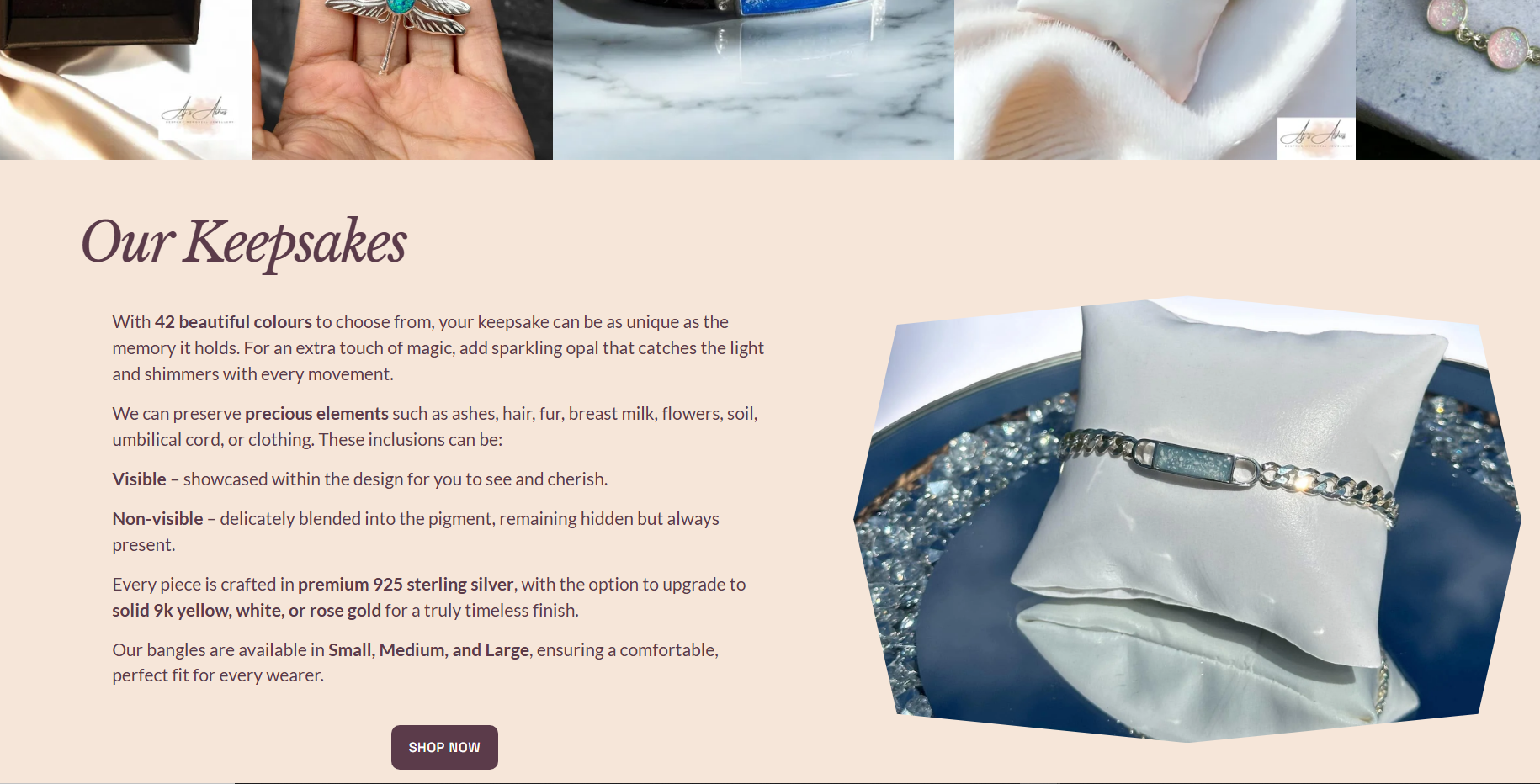 AJ’s Ashes is a heartfelt business creating bespoke memorial jewellery and ornaments that hold ashes, hair, fur, or other keepsakes. Founder Leigha wanted a beautiful, easy-to-use website that reflected the sensitivity and care behind her products while making it simple for customers to explore, personalise, and order.