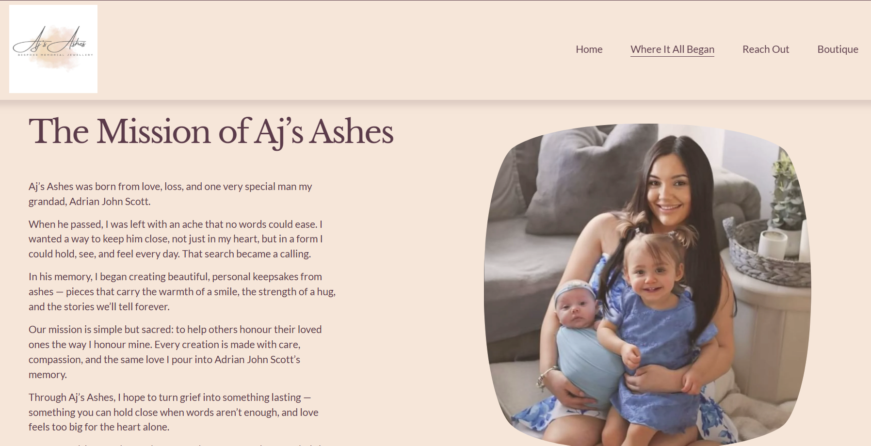 “Jessica, I can’t thank you enough for the beautiful website you’ve created for AJ’s Ashes – bespoke memorial jewellery and ornaments. You’ve captured my business perfectly and made the whole process feel so easy, having taken it out of my hands! I love how much care and thought you put into every detail, and the way everything came together so beautifully. You’ve honestly been such a joy to work with, and I’d recommend you to anyone looking for a kind, talented person to bring their website to life!” — Leigha, Founder